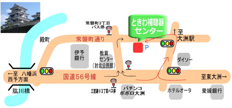※国道56号、肘北公民館、三笠通り3丁目バス停、パチンコポポロ大洲の角より入る。 | |